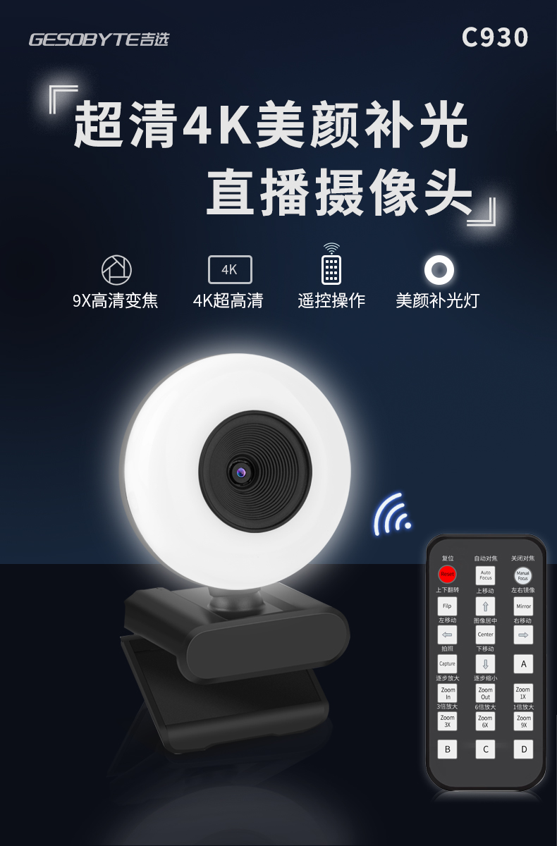 吉选C930直播摄像头,4K超清,自带补光灯,9倍高清变焦
